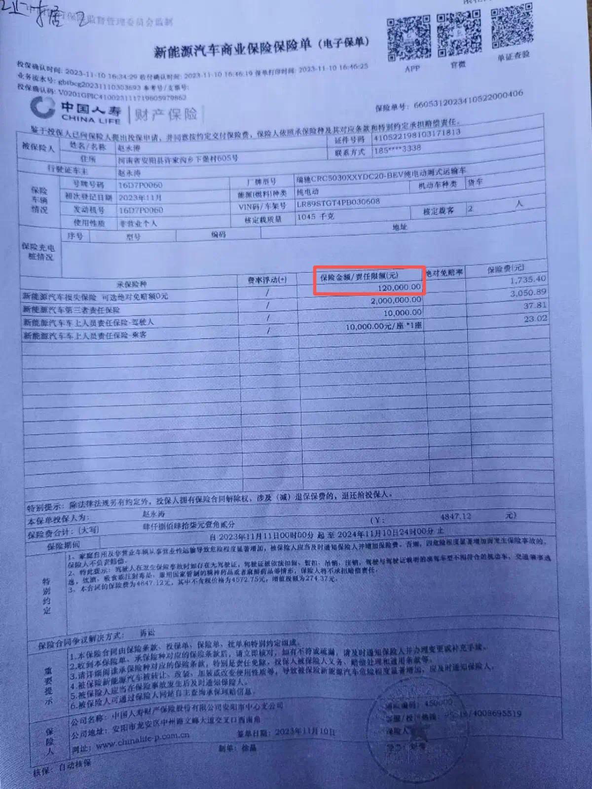 近日,市民赵先生向大河报邻妹妹求助,其2023年10月在福建省厦门市购买了一辆“瑞驰牌”新能源小货车,并在车辆销售人员的推荐下,在中国人寿财产保险股份有限公司安阳市中心支公司(以下简称“人寿财险安阳支公司”)为爱车购买了保险。