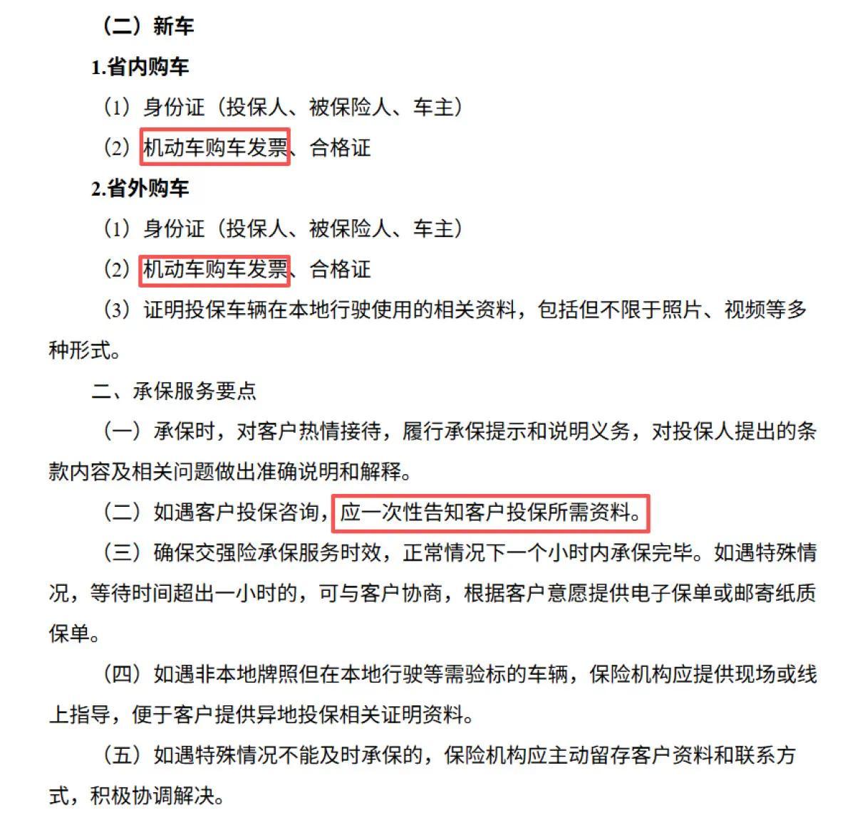 而在上文所提到的两个规范文件中,“购车发票”均为新车投保所需要提供的资料,并未注明“可选择性提供”。并且在承保服务要点中,明确了保险员“应一次性告知客户投保所需资料”。