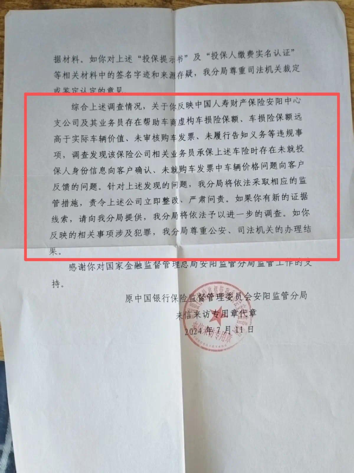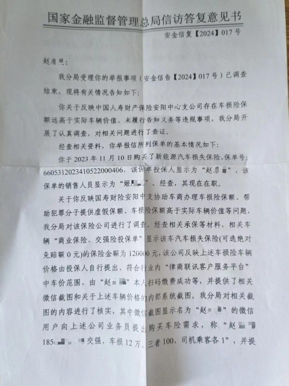 “经过我投诉,国家金融监督管理总局安阳监管分局调查后给我书面回复材料,告知我该保险公司相关业务员承保上述车险时,存在未就投保人身份信息向客户确认、未就购车发票中车辆价格问题向客户反馈的问题。但人寿财险安阳支公司仅对涉事的业务员进行了内部处理,不仅不承认超额承保,反而认为我发票低开,对赔偿问题更是扯皮耍赖。”赵先生说。